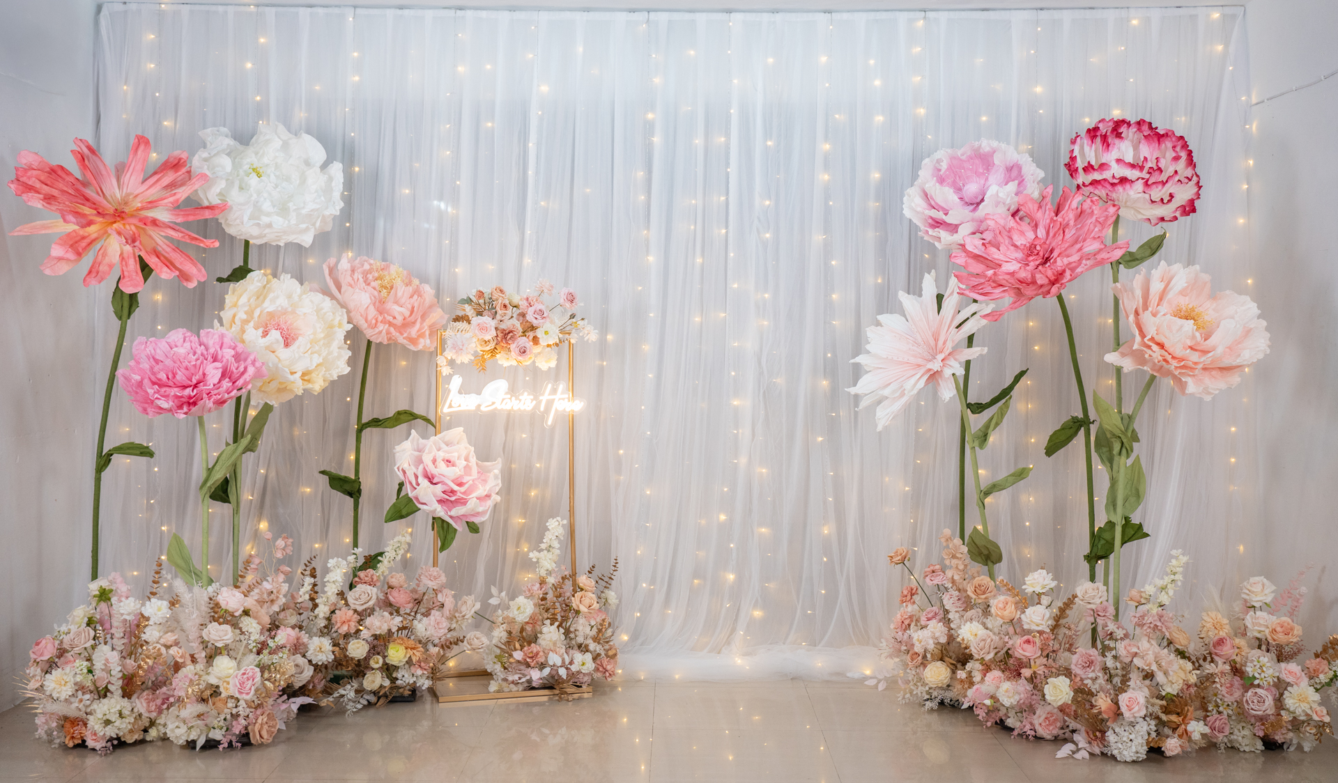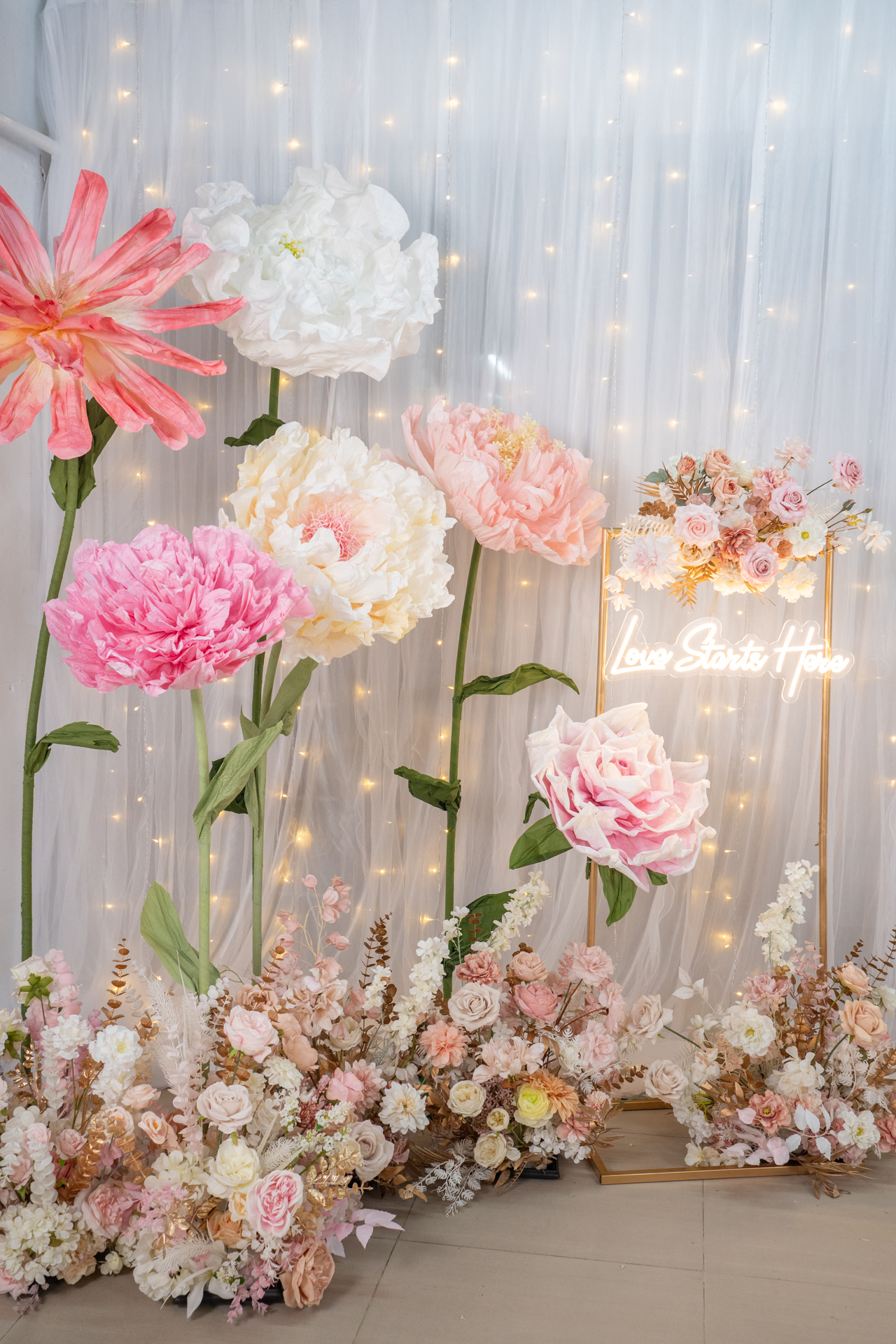 金色迎賓拱門&仿真花藝、手工大花1朵 搭配公版霓虹文字